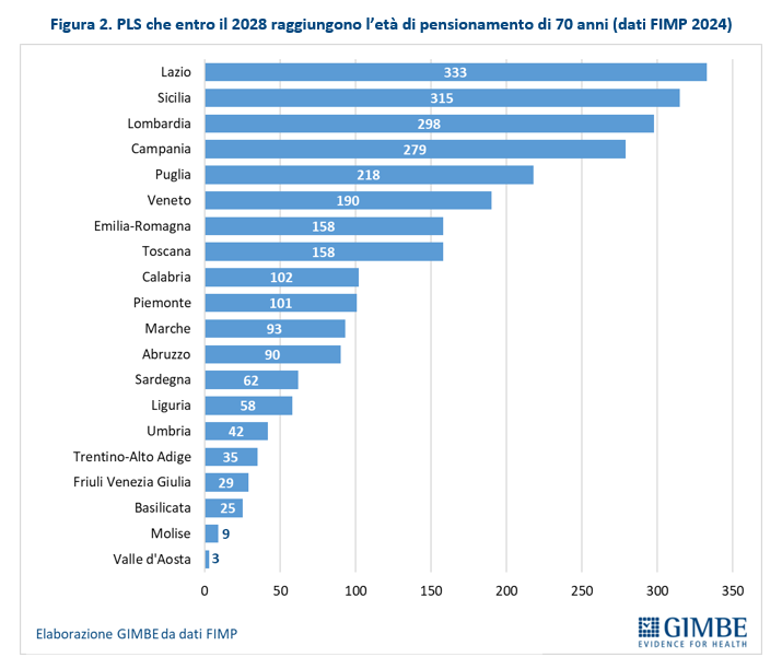 Secondo i dati 2024 forniti dalla Federazione Italiana dei Medici Pediatri (FIMP), tra il 2024 e il 2028 andranno in pensione 2.598 pediatri di libera scelta, avendo raggiunto il limite massimo di età previsto, pari a 70 anni (salvo deroghe): dai 333 PLS del Lazio a 3 PLS in Valle d’Aosta (figura 2).