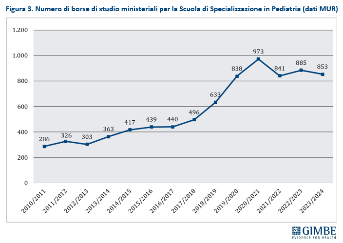 Il numero di borse di studio per la scuola di specializzazione in pediatria, rimasto stabile per un decennio, ha registrato un incremento significativo negli ultimi 6 anni: da 496 borse nell’anno accademico 2017-2018 a 853 nel 2023-2024, con un picco di 973 nell’anno accademico 2020-2021 (figura 3). “Tuttavia – osserva Cartabellotta – considerato che gli specialisti in pediatria possono intraprendere anche la carriera ospedaliera, non è possibile prevedere quanti sceglieranno effettivamente di diventare PLS. Di conseguenza resta incerto se le nuove leve riusciranno a garantire un ricambio generazionale adeguato e uniforme in tutte le Regioni, oltre che colmare le attuali carenze”.