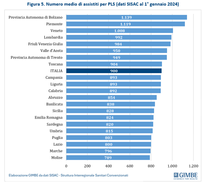 Secondo le rilevazioni della Struttura Interregionale Sanitari Convenzionati (SISAC), al 1° gennaio 2024 risultavano attivi 6.484 PLS, con in carico oltre 5,8 milioni di assistiti: il 42,5% nella fascia 0-5 anni (2,48 milioni) e il 57,5% nella fascia 6-13 anni (3,35 milioni). Complessivamente, l’81,2% della popolazione ISTAT tra 6 e 13 anni risulta seguita da un PLS, con marcate differenze regionali: dal 92,6% della Liguria al 60,7% della Sardegna (figura 4). In termini assoluti, la media nazionale è di 900 assistiti per PLS: superano il massimale di 1.000 assistiti la Provincia Autonoma di Bolzano (1.139), il Piemonte (1.119) e il Veneto (1.008) (figura 5). “Con un simile livello di saturazione – spiega Cartabellotta – il principio della libera scelta viene spesso ostacolato: in molte aree del Paese diventa difficile, se non impossibile, trovare un pediatra disponibile, sia nelle zone interne o periferiche, sia nei grandi centri urbani. In altre parole, la situazione reale è spesso più critica di quanto lascino intendere i numeri”.