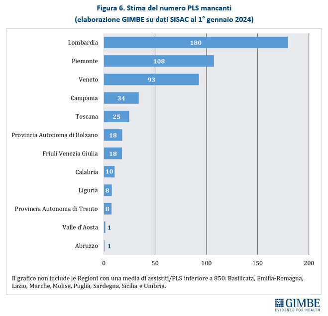 “Tutte le criticità fin qui evidenziate – spiega Cartabellotta – permettono soltanto di stimare il fabbisogno di PLS a livello regionale, poiché l’individuazione delle zone carenti da parte delle ASL dipende da molteplici variabili locali”. Se l’obiettivo è garantire la qualità dell’assistenza, una distribuzione capillare coerente con la densità abitativa, la prossimità degli ambulatori e il diritto alla libera scelta, non è corretto stimare il fabbisogno di PLS facendo riferimento al massimale con deroga. Per questo motivo la Fondazione GIMBE, adottando il rapporto ottimale di 1 PLS ogni 850 assistiti e utilizzando le rilevazioni SISAC al 1° gennaio 2024, stima una carenza complessiva di 502 PLS, con forti squilibri regionali. Infatti, il 75,7% delle carenze si concentra in 3 sole grandi Regioni del Nord: Lombardia (180), Piemonte (108), Veneto (93). Al contrario, in 9 Regioni (Basilicata, Emilia-Romagna, Lazio, Marche, Molise, Puglia, Sardegna, Sicilia e Umbria) non si rileva alcuna carenza, poiché la media di assistiti per PLS è inferiore a 850 (figura 6). “In realtà – precisa Cartabellotta – è necessario considerare due aspetti fondamentali. Anzitutto, l’ultimo ACN ha innalzato il rapporto ottimale da 600 a 850, “assorbendo” di fatto una quota consistente delle carenze registrate al 1° gennaio 2023. In secondo luogo, una stima su base regionale non intercetta le carenze localizzate, che si manifestano in territori a bassa densità abitativa, zone disagiate, aree montane”.