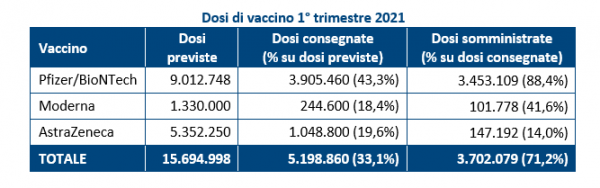 La continua revisione al ribasso, documentata dai quattro aggiornamenti ufficiali delle forniture attese, in soli due mesi ha quasi dimezzato le dosi previste per il primo trimestre 2021 che sono precipitate da 28,3 a 15,7 milioni. «Una riduzione di tale entità – commenta Cartabellotta – se da un lato è imputabile ai ritardi di produzione e consegna da parte delle aziende, dall’altro risente di irrealistiche stime di approvvigionamento del Piano vaccinale originale». Inoltre, delle dosi previste per il primo trimestre 2021, al 24 febbraio (aggiornamento ore 08.01) ne sono state consegnate alle Regioni solo un terzo: per rispettare le scadenze nelle prossime 5 settimane dovranno essere consegnate in media 2,3 milioni di dosi/settimana.
