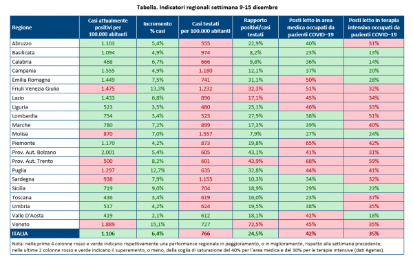 Nuova flessione dei casi positivi nella settimana 9-15 dicembre, secondo il monitoraggio indipendente della Fondazione Gimbe. Si arriva a 113.182 contro i 136.493 della scorsa settimana, a fronte di una riduzione di oltre 88 mila casi testati e di un rapporto positivi/casi testati stabile (24,5% vs 24,8%).