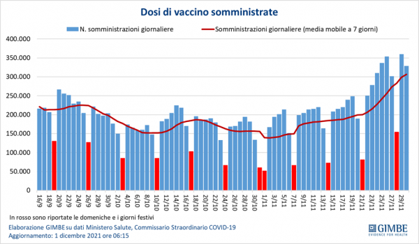 Al 1° dicembre (aggiornamento ore 06.15) il 79,7% della popolazione (n. 47.226.119) ha ricevuto almeno una dose di vaccino (+297.415 rispetto alla settimana precedente) e il 77,1% (n. 45.683.073) ha completato il ciclo vaccinale (+247.367 rispetto alla settimana precedente). Cresce nell’ultima settimana il numero di somministrazioni (n. 1.984.561) con una media mobile a 7 giorni di 306.445 somministrazioni/die: decollano finalmente le terze dosi (+52,5% rispetto alla settimana precedente), affiancate da prime dosi di nuovo in crescita (+34,7% rispetto alla settimana precedente).