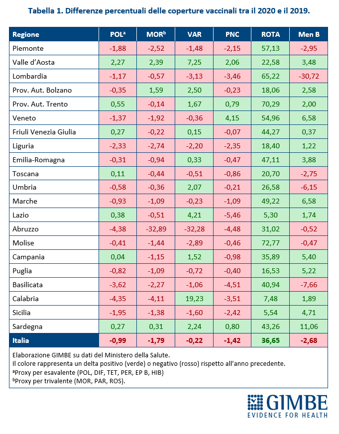 Vaccinazioni obbligatorie. Il vaccino anti-poliomielite mostra una riduzione della percentuale di vaccinati in 14 Regioni, con un decremento superiore a 2 punti percentuali in Abruzzo, Basilicata, Calabria e Liguria. Tra le Regioni in cui si osserva un incremento, la Valle d’Aosta è l’unica a raggiungere un aumento superiore a 2 punti percentuali. La riduzione delle coperture appare più marcata per la vaccinazione anti-morbillo, dove 18 Regioni mostrano un calo rispetto al 2019, con decrementi superiori a 2 punti percentuali in Abruzzo, Calabria, Liguria, Piemonte e Basilicata; registrano un incremento solo Sardegna (+0,31 punti percentuali), Provincia Autonoma di Bolzano (+1,59 punti percentuali) e Valle d’Aosta (+2,39 punti percentuali). Per la vaccinazione anti-varicella le coperture diminuiscono in 11 Regioni con Abruzzo, Lombardia, Molise e Liguria che registrano una riduzione superiore a 2 punti percentuali, mentre aumentano nelle restanti 10 Regioni, con Umbria, Sardegna, Provincia Autonoma di Bolzano, Lazio, Valle d’Aosta e Calabria che mostrano un aumento superiore a due punti percentuali.