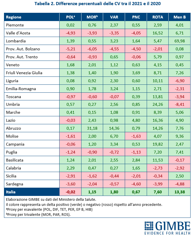Vaccinazioni raccomandate. Le differenze 2021 vs 2020 delle coperture per le vaccinazioni raccomandate sono molto eterogenee, sia tra vaccini che tra Regioni. La vaccinazione anti-pneumococco, ad esempio, mostra una differenza che va -4,6 punti percentuali della Sardegna a +4,8 punti percentuali del Lazio, con 14 Regioni che registrano un aumento nelle percentuali delle coperture, 3 delle quali superano i 2 punti percentuali (Basilicata, Friuli Venezia Giulia e Lazio). L’eterogeneità appare ancora più marcata per l’anti-rotavirus (le variazioni 2021 vs 2020 passano da -3,99 punti percentuali in Sardegna a +24,26 punti percentuali in Umbria) e l’anti-meningococco B (da -8,41 punti percentuali dell’Umbria a +69,98 punti percentuali della Lombardia).
