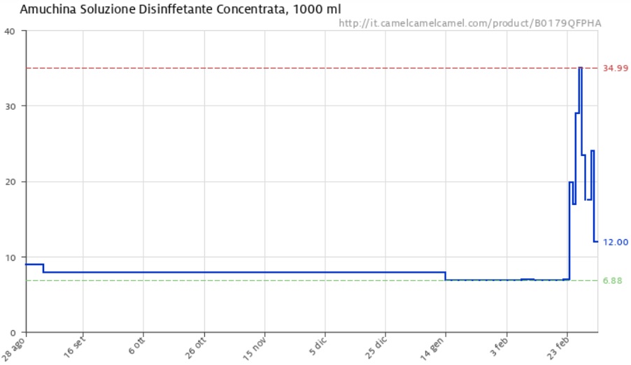 Dall’immagine qui sopra si può vedere come questo negozio vendeva un noto disinfettante ad un prezzo tutto sommato in linea con il mercato: 6,88 euro. Questo fino al 23 febbraio, quando, in pochi giorni, è passato prima a 20, poi a 29, fino ad arrivare ad un picco di 34,99 euro, prima di riassestarsi sui 12 euro (che è comunque circa il doppio rispetto al prezzo pre-Coronavirus). Di esempi come questo ce ne sono ovviamente anche altri, come si può vedere dall’immagine qui sotto.