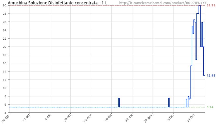 E difatti oggi Amazon è quasi completamente priva di annunci dai prezzi gonfiati. Ce n’è però ancora qualcuno che resiste: un venditore, ad esempio, offre quattro flaconcini di un noto disinfettante gel (per un totale di 320ml di prodotto) alla modica cifra di 90 euro. Ma consultando un sito che traccia l’andamento dei prezzi dei prodotti in vendita su Amazon in un dato lasso di tempo si può vedere come molti dei rivenditori che oggi propongono gli stessi prodotti a prezzi tutto sommato in linea con il mercato (o poco più alti) abbiano, nelle scorse settimane, alzato i prezzi per poi riabbassarli dopo l’invito di Amazon.