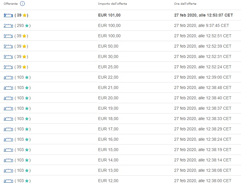Come si vede dall’immagine, un singolo soggetto ha rilanciato più volte la sua offerta (che fino a quel momento era la migliore, quindi senza un motivo apparente per farlo), seguito da un altro contendente che ha alzato di molto la posta, mettendo sul piatto prima 25, poi 30, poi 50, poi 100 euro nello spazio di neanche un minuto. Il prezioso flacone se lo è, alla fine, aggiudicato lui, ma per quale motivo una persona dovrebbe rilanciare più volte la sua stessa offerta, così, senza motivo, apparentemente solo per far lievitare il prezzo?
