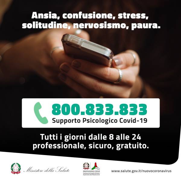 Un forte impatto economico, sociale e psicologico. «L’emergenza Covid-19 sta mettendo a dura prova la tenuta psicologica delle persone alle prese con una situazione inedita nella sua drammaticità. Il timore del contagio, le misure di isolamento, tanto indispensabili sul piano sanitario, quanto difficili su quello umano, la solitudine, i lutti, le incertezze economiche: tutti elementi che possono far nascere attacchi di ansia, stress, paure, disagio. Per queste ragioni da oggi, 27 aprile, sarà operativo il numero verde di supporto psicologico 800.833.833, attivato dal Ministero della Salute e dalla Protezione Civile, con il sostegno tecnologico offerto gratuitamente da TIM. Un numero scelto rendendo omaggio alla Legge 23 dicembre 1978, numero 833, che ha istituito il Servizio Sanitario Nazionale. Il numero sarà raggiungibile anche dall’estero al 02.20228733 e saranno previste modalità di accesso anche per i non udenti». Così il ministero della salute in una nota.