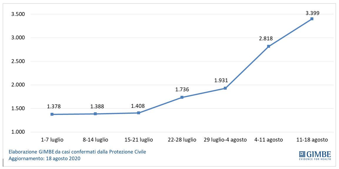 Anche il monitoraggio indipendente della Fondazione GIMBE conferma l’andamento riscontrato dalla cabina di regia. Sebbene i numeri si riferiscano alla settimana 12-18 agosto, GIMBE rileva, rispetto alla precedente, un incremento del 20,6% dei nuovi casi (3.399 vs 2.818, un valore superiore al 140% rispetto alla settimana 15-21 luglio, quando erano 1.408), a fronte di un lieve aumento dei casi testati (180.300 vs 174.671). Relativamente ai dati ospedalieri, in crescita i pazienti ricoverati con sintomi (843 vs 801) e quelli in terapia intensiva (58 vs 49).