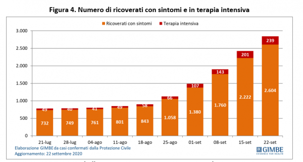 Da fine luglio i nuovi positivi sono quadruplicati, da 12.482 a 45.489. Sebbene la distribuzione per regioni sia molto varia, dipendendo da tre variabili essenziali: densità del contagio (casi per 100 mila abitanti), velocità di diffusione e capacità di testing. L’incremento progressivo dei casi attualmente positivi si riflette anche sull’aumento delle ospedalizzazioni: infatti, in 2 mesi i pazienti ricoverati con sintomi sono aumentati da 732 a 2.604 e quelli in terapia intensiva da 49 a 239.