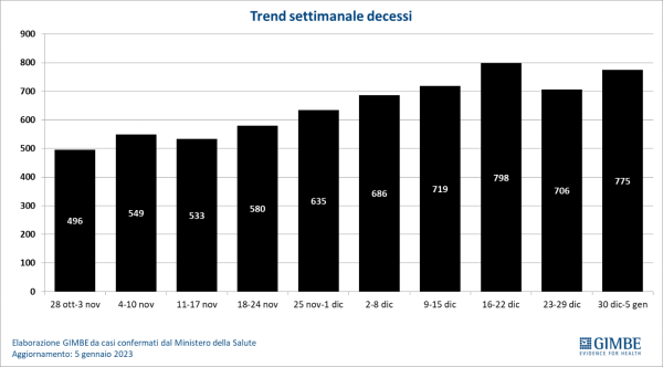 Il monitoraggio indipendente della Fondazione GIMBE rileva nella settimana 30 dicembre 2022-5 gennaio 2023, rispetto alla precedente, un aumento di nuovi casi (135.977 vs 122.099) e dei decessi (775 vs 706). In calo i casi attualmente positivi (406.182 vs 417.661), le persone in isolamento domiciliare (398.147 vs 409.059), i ricoveri con sintomi (7.716 vs 8.288). Stabili le terapie intensive (319 vs 314).