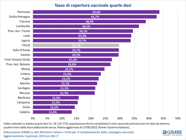 La platea per il secondo richiamo (quarta dose), aggiornata al 17 settembre, è di 19,1 milioni di persone: di queste, 11,7 milioni possono riceverlo subito, 1,7 non sono eleggibili nell’immediato in quanto guarite da meno di 120 giorni e 5,7 milioni l’hanno già ricevuto. Al 6 gennaio (aggiornamento ore 06.17) sono state somministrate 5.675.250 quarte dosi, con una media mobile di 9.550 somministrazioni al giorno, in aumento rispetto alle 6.275 della scorsa settimana (52,2%). In base alla platea ufficiale (n. 19.119.772 di cui 13.060.462 over 60, 3.990.080 fragili e immunocompromessi, 1.748.256 di personale sanitario e 320.974 di ospiti delle RSA che non ricadono nelle categorie precedenti), il tasso di copertura nazionale per le quarte dosi è del 29,7% con nette differenze regionali: dal 13,4% della Calabria al 43,6% del Piemonte.