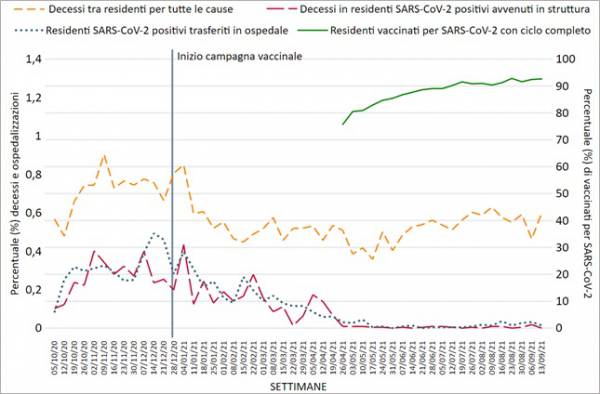 La mortalità settimanale nelle Rsa per l’infezione da SARS-CoV-2 è diminuita in maniera netta dall’inizio della campagna di vaccinazione ed è rimasta inferiore allo 0,01% anche nelle ultime settimane. È quanto emerge dal terzo aggiornamento del report di sorveglianza sulle strutture realizzato dall’ISS (Istituto Superiore di Sanità) in collaborazione con il Ministero della Salute, il Garante nazionale dei diritti delle persone private della libertà personale e l’ARS Toscana. Il report segnala da luglio un nuovo aumento nel numero di casi, segno della necessità di rinforzare l’immunità degli ospiti.