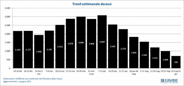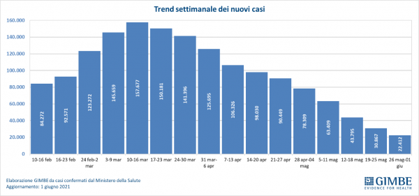 Il monitoraggio indipendente della Fondazione Gimbe rileva nella settimana 26 maggio-1 giugno 2021, rispetto alla precedente, un’ulteriore diminuzione di nuovi casi (22.412 vs 30.867) e decessi (720 vs 1.004). In netto calo anche i casi attualmente positivi (225.751 vs 268.145), le persone in isolamento domiciliare (218.570 vs 258.265), i ricoveri con sintomi (6.192 vs 8.557) e le terapie intensive (989 vs 1.323).