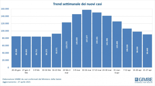 Il monitoraggio della Fondazione GIMBE rileva nella settimana 21-27 aprile 2021 una diminuzione di nuovi casi (90.449 vs 98.030) e decessi (2.279 vs 2.545). In calo anche i casi attualmente positivi (448.149 vs 482.715), le persone in isolamento domiciliare (425.089 vs 456.309), i ricoveri con sintomi (20.312 vs 23.255) e le terapie intensive (2.748 vs 3.151).