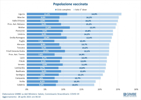 Al 28 aprile risultano consegnate il 29,5% delle dosi previste per il 1° semestre 2021: 22.463.020 dosi, di cui 2,2 milioni di Pfizer/BioNTech non ancora inserite nel database. «Le consegne dei vaccini stanno aumentando – spiega Cartabellotta – ma l’incremento settimanale non è costante e ancora lontano da quota 3,5 milioni di dosi, indispensabili per raggiungere il target di 500 mila somministrazioni al giorno».