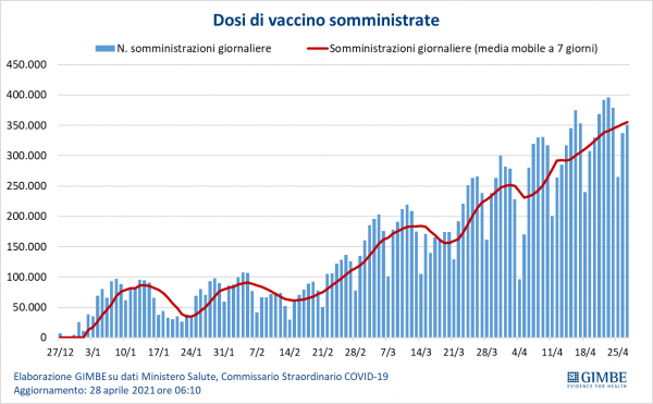 Al 28 aprile il 22% della popolazione ha ricevuto almeno una dose di vaccino (n. 13.072.472) e il 9,1% ha completato il ciclo vaccinale (n. 5.430.357), con differenze regionali che si vanno progressivamente appiattendo. Le somministrazioni continuano gradualmente a salire, sia guardando al numero delle dosi settimanali (+10,7% negli ultimi 7 giorni), sia alla media mobile a 7 giorni, aumentata da 324.081/die (20 aprile) a 355.582/die (27 aprile). «Nonostante questo incremento – commenta Gili – il numero di vaccinazioni giornaliere non raggiunge i target definiti per la settimana 22-29 aprile dal Commissario Straordinario, documentando difficoltà organizzative in alcune Regioni nella somministrazione tempestiva delle dosi disponibili. Si conferma inoltre una netta riduzione delle inoculazioni nei giorni festivi».