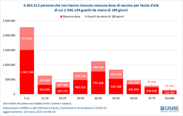 Al 23 marzo sono ancora 6,96 milioni le persone che non hanno ricevuto nemmeno una dose di vaccino, di cui 2,45 milioni temporaneamente protette in quanto guarite da COVID-19 da meno di 180 giorni. Di conseguenza, le persone attualmente vaccinabili sono circa 4,51 milioni, un dato che non tiene conto delle esenzioni di cui non si conosce il numero esatto. In base alla platea ufficiale (n. 45.878.964), aggiornata al 18 marzo, il tasso di copertura nazionale per le terze dosi è dell’84% con nette differenze regionali: dal 78,7% della Sicilia all’87,9% della Valle D’Aosta. Delle 7.338.927 persone che non hanno ancora ricevuto la dose booster, 2,53 milioni potrebbero riceverla subito, mentre gli oltre 4,8 milioni di guariti da meno di 120 giorni non sono candidati a riceverla nell’immediato.