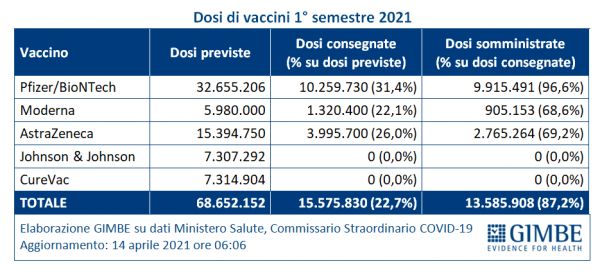 Al 14 aprile, al netto dei ritardi di notifica, risultano consegnate 15.575.830 dosi, pari al 22,7% delle dosi previste per il 1° semestre 2021.