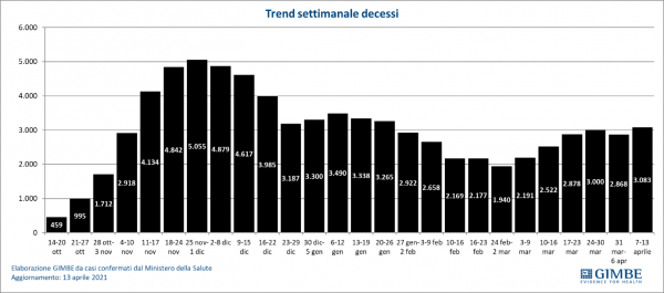 Il monitoraggio indipendente della Fondazione Gimbe rileva nella settimana 7-13 aprile 2021, rispetto alla precedente, una diminuzione dei nuovi casi (106.326 vs 125.695), a fronte di un aumento dei decessi (3.083 vs 2.868). In calo i casi attualmente positivi (519.220 vs 555.705), le persone in isolamento domiciliare (488.742 vs 522.625), i ricoveri con sintomi (26.952 vs 29.337) e le terapie intensive (3.526 vs 3.743) (figura 3).