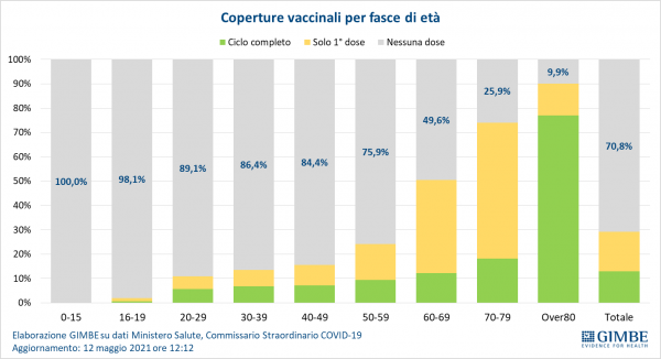Al 12 maggio (aggiornamento ore 12.12), il 29,2% della popolazione ha ricevuto almeno una dose di vaccino (n. 17.413.508) e il 13% ha completato il ciclo vaccinale (n. 7.725.554), con importanti differenze regionali: dal 32,7% di vaccinati con almeno una dose della Provincia Autonoma di Trento al 24,6% della Sicilia. Aumentano le somministrazioni settimanali (+8,5%), ma in maniera minore rispetto alla settimana precedente con una media mobile a 7 giorni che si attesta intorno a 465 mila somministrazioni al giorno. «Il mancato sprint della campagna vaccinale – precisa Gili – è influenzato dalla mancata somministrazione di 1.286.041 dosi di AstraZeneca, le cui scorte “in frigo” oscillano dal 4,7% del Molise al 46% della Sicilia. Tenendo conto che l’uso preferenziale di questo vaccino è negli over 60, è inevitabile che i rifiuti influenzino la copertura vaccinale in questa classe d’età».