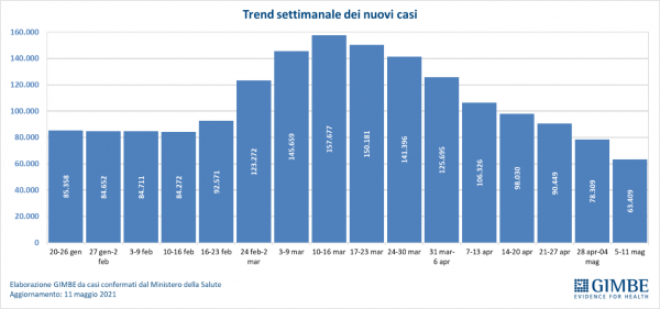 Il monitoraggio indipendente della Fondazione Gimbe rileva nella settimana 5-11 maggio 2021, rispetto alla precedente, una diminuzione di nuovi casi (63.409 vs 78.309) e decessi (1.544 vs 1.826). In calo anche i casi attualmente positivi (363.859 vs 413.889), le persone in isolamento domiciliare (346.866 vs 393.290), i ricoveri con sintomi (14.937 vs 18.176) e le terapie intensive (2.056 vs 2.423).