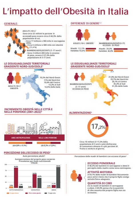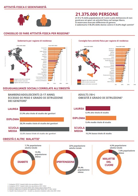 Secondo i dati Istat presentati lo scorso ottobre durante il quinto Italian Obesity Barometer Summit, in Italia nel 2022 la percentuale di adulti con sovrappeso e obesità, pari al 46,3 per cento, è tornata ai livelli pre-pandemia, durante la quale si era raggiunto il picco del 47,6 per cento. Tuttavia, è solo il numero di persone con sovrappeso che è sceso, tanto che quello delle persone con obesità è passato dal 10,9 per cento del 2019 all’11,4 per cento nel 2022, con un picco del 12 per cento nel 2021. Solo il 17,2 per cento della popolazione di 3 anni e più in Italia dichiara di consumare almeno 4 o più porzioni di frutta o verdura al giorno. Oltre 21 milioni di persone, ovvero il 37,2 per cento della popolazione di 3 anni e più, dichiarano di non praticare né sport né attività fisica nel tempo libero, con marcate differenze di genere: è sedentario il 40,6 per cento delle donne contro il 33,6 per cento degli uomini. Il 59,1 per cento delle madri di bambini fisicamente poco attivi ritiene che il proprio figlio svolga attività fisica adeguata.