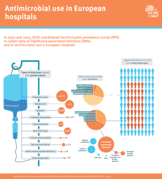 È stato osservato un aumento anche per l’uso degli antimicrobici rispetto alle indagini precedenti. Nel 2022-2023, il 35,5% dei pazienti ha ricevuto almeno un agente antimicrobico, rispetto al 32,9% del precedente PPS nel 2016-2017. Ogni giorno nell’UE/SEE, circa 390.000 pazienti ospedalizzati ricevono almeno un antibiotico. Una preoccupazione particolare è che 1 microrganismo su 3 rilevato nelle infezioni ospedaliere era resistente a importanti antibiotici, limitando così le opzioni per il trattamento dei pazienti infetti.