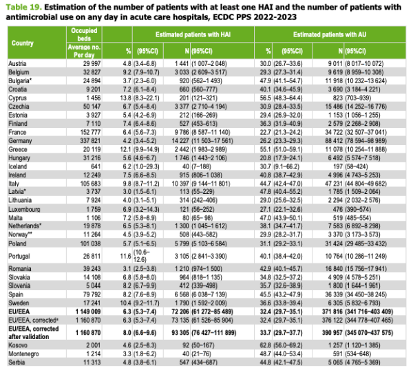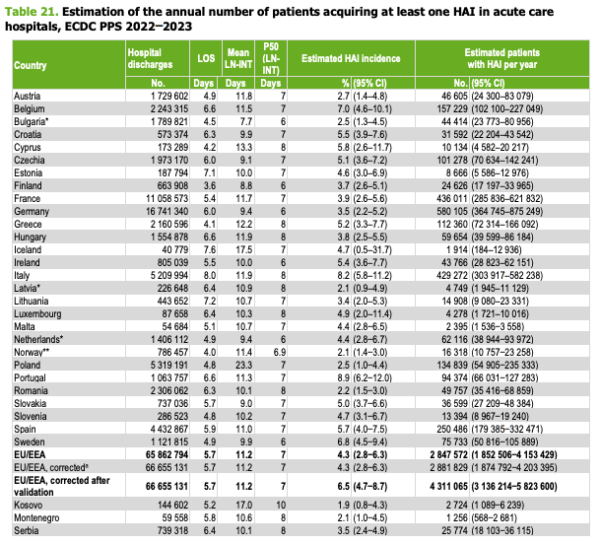 Il numero di pazienti con almeno un’infezione ospedaliera durante un ricovero per acuti nei Paesi UE/SEE è stato stimato in 93.305 pazienti. Mentre il numero di pazienti che ha ricevuto almeno un antibiotico durante il ricovero è stato di 390.957. Per quanto riguarda l’Italia, salta all’occhio il dato riguardante la stima annuale di infezioni ospedaliere di 429.272 che corrisponde ad una stima dell’8,2%, non solo superiore alla media europea del 6,5%, ma anche il secondo peggior risultato del continente dopo il Portogallo (8,9%).