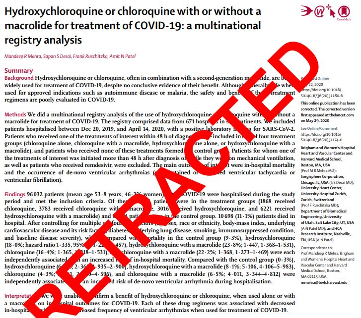 “Retracted”. La scritta rossa (in italiano “ritirato”) copre quasi come un cerotto tutte le pagine dello studio pubblicato sulla prestigiosa rivista The Lancet che bocciava l’idrossiclorochina, il farmaco vecchio oltre ottant’anni tornato prepotentemente alla ribalta come possibile arma contro il Covid-19.