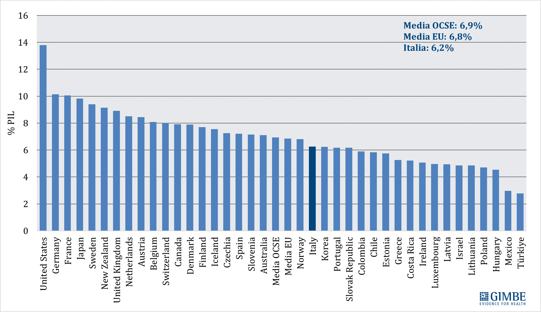 In Italia si investe troppo poco in sanità pubblica. L’ennesima dimostrazione arriva dal Report Gimbe: per il 2023 il Belpaese si colloca al 16esimo posto tra i 27 Paesi europei dell’area Ocse e in ultima posizione tra quelli del G7. La spesa sanitaria pubblica si attesta al 6,2% del Pil, percentuale inferiore sia rispetto alla media Ocse del 6,9%, sia rispetto alla media europea del 6,8%”. I dati sono frutto di un’analisi della Fondazione Gimbe che ha redatto un Report dedicato alla spesa sanitaria pubblica 2023 nei paesi dell’Ocse. Il documento, come precisato dagli stessi autori, è stato stilato al fine di fornire dati oggettivi “per il confronto politico e il dibattito pubblico e prevenire ogni forma strumentalizzazione”.