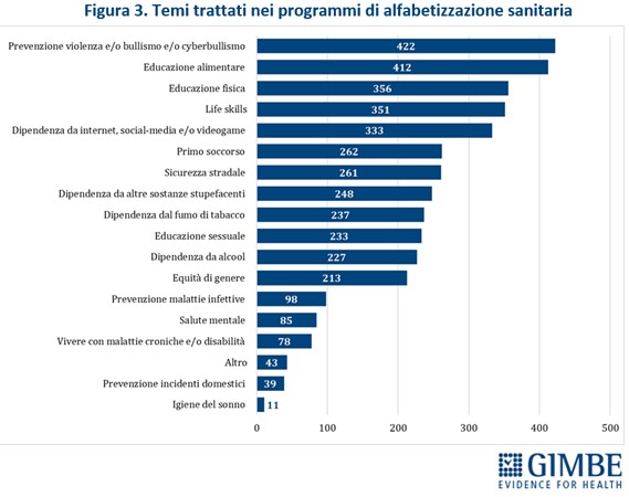 La ricerca evidenzia che solo il 60,8% degli istituti monitora regolarmente l’attuazione del programma scolastico portato avanti con il fine di sostenere la salute e il benessere. Tra i temi più trattati, da oltre il 70% delle scuole, ci sono: prevenzione di violenza, bullismo e cyberbullismo, educazione alimentare, educazione fisica, life skills. In due scuole su tre viene approfondita anche la dipendenza da internet e videogame. “Da rilevare – puntualizza Cartabellotta – che tutti i temi sono risultati più frequentemente trattati negli istituti aderenti al programma Sps rispetto a quelli non aderenti. Ma alcuni argomenti rilevanti, quali salute mentale e prevenzione delle malattie infettive, sono trattati in meno di un istituto su cinque”.