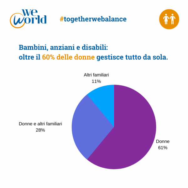 Con la chiusura delle scuole e le difficoltà riscontrate nel supporto alle persone con disabilità e agli anziani, il 61% delle donne dichiara di aver dovuto gestire la famiglia da sola. Una percentuale che arriva al 71% nella fascia d’età tra i 31 e i 50 anni. Al Sud solo il 7% delle donne cede ad altri l’attività di caregiving, mentre al Nord un 16% dell’aiuto è fornito dai nonni, il cui compito è stato molto penalizzato durante la pandemia. Nella fascia 18-30 anni, l’85% delle donne si prende cura dei figli senza aiuti. Solo un 15% dichiara di condividere le incombenze con il partner.