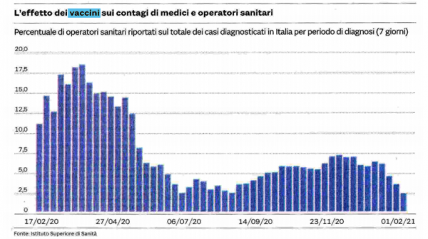 Secondo i risultati esposti dalla Fondazione Gimbe, due settimane fa i contagi tra i professionisti sanitari erano scesi del 64,2% rispetto al mese precedente, passando da quasi 5mila casi in sette giorni a meno di 1.500 e in continuo abbassamento. Un primo successo per l’Italia che respira di fronte alla speranza di una prossima protezione totale delle sue risorse più importanti contro la pandemia.
