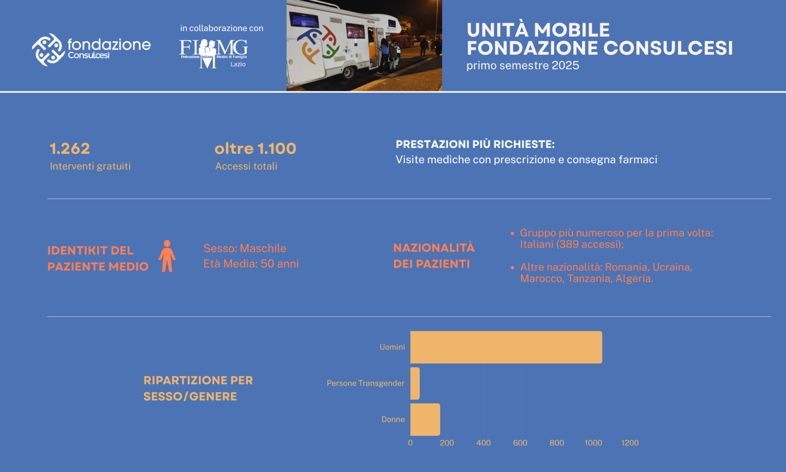 Cinquantenne, uomo e italiano. È il profilo medio di chi cerca assistenza sanitaria presso l’Unità Unità Mobile “Salute e Inclusione”. Il servizio della Fondazione Consulcesi in collaborazione con Fimmg Lazio continua a confermare il suo ruolo di presidio sanitario di prossimità nella Capitale, confermando i recenti dati Istat e Caritas sulle difficoltà di accesso alle cure non solo della popolazione straniera.