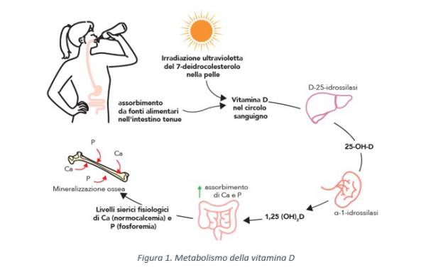 La fonte principale di vitamina D per molte popolazioni è l’esposizione alla luce solare, i cui raggi ultravioletti convertono il 7-deidrocolesterolo, presente nella pelle, trasformato in vitamina D3. Una volta formata, la vitamina D3 viene ulteriormente metabolizzata nel fegato a calcidiolo (25-OH-D) e successivamente nei reni per essere convertita nella sua forma attiva, il calcitriolo (1,25-(OH)2-D).