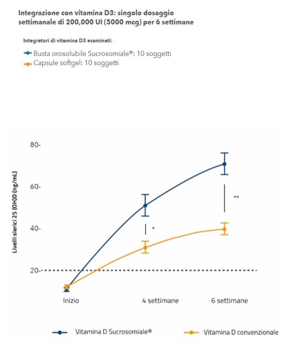 Un recente studio7 ha confrontato l’efficacia dell’assorbimento gastrointestinale di una formulazione orale di vitamina D3 Sucrosomiale® ad alte dosi (200.000 UI) con quella delle compresse masticabili e dei softgel tradizionali, coinvolgendo adulti sani con carenza di vitamina D, con livelli sierici di 25-OH-D inferiori a 20 ng/mL.