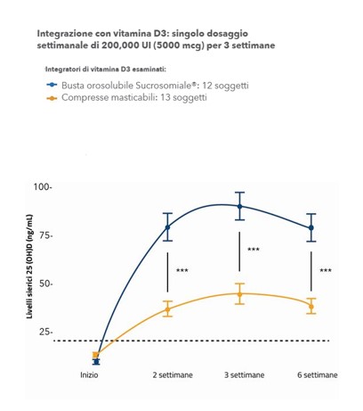 Un recente studio7 ha confrontato l’efficacia dell’assorbimento gastrointestinale di una formulazione orale di vitamina D3 Sucrosomiale® ad alte dosi (200.000 UI) con quella delle compresse masticabili e dei softgel tradizionali, coinvolgendo adulti sani con carenza di vitamina D, con livelli sierici di 25-OH-D inferiori a 20 ng/mL.